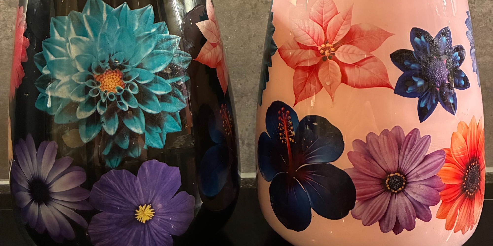 De plaatjes worden geplakt op de vaas om vervolgens de vaas te verven.
