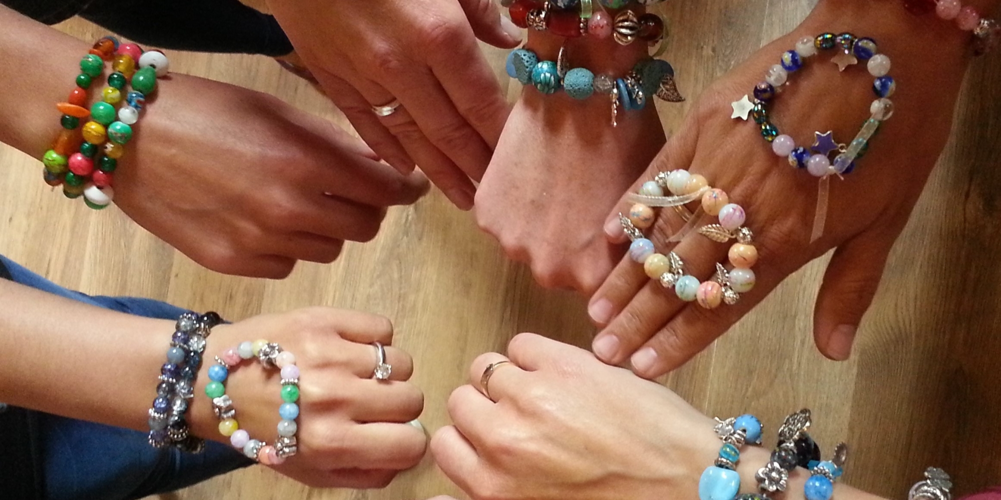 Je kunt kiezen uit het maken van een armband of een ketting, waar verschillende technieken, allerlei kleuren kralen en bedels kunnen worden gebruikt.