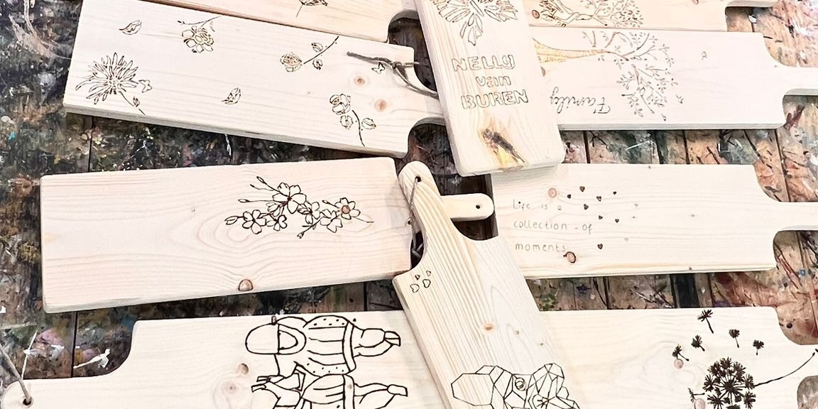 Er zijn diverse sjablonen, teksten en afbeeldingen die op de steigerhouten plank gemaakt kunnen worden. Houtbranden is niet altijd makkelijk. Geduld komt om de hoek kijken. Je kunt ook een persoonlijk ontwerp meenemen. Print het uit en neem het mee. Het ontwerp wordt op de plank overgezet. Maak jij je een eigen ontwerp, houd dan rekening met de afmetingen van de plank (circa 70 cm lang en 20 cm breed). De workshop duurt 2 uur (van 19.00 tot 21.00 uur).